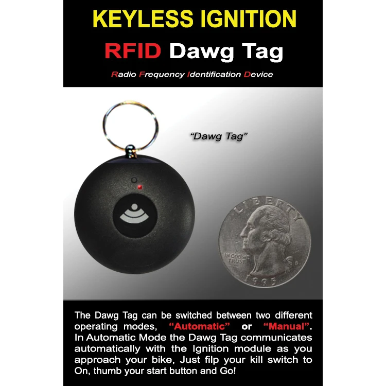 • Simply carry one of the systems digital RFID “Dawg Tags” with you. When you’re ready to ride, just flip your RUN switch ON, thumb the start button and GO! When your ride is over, kill the engine and just walk away . . .