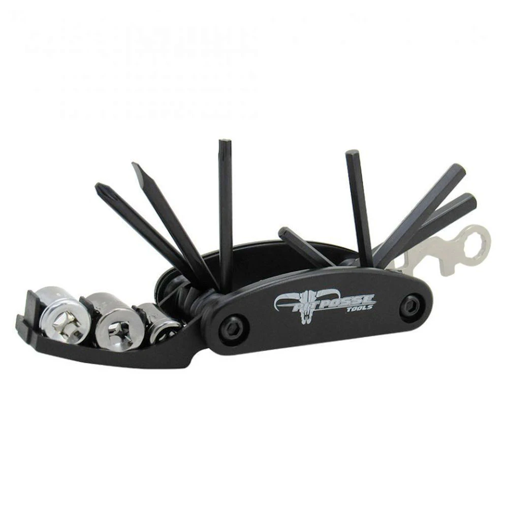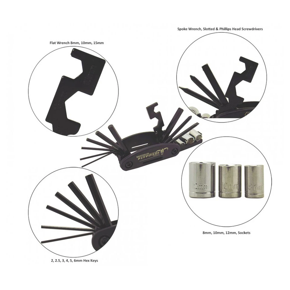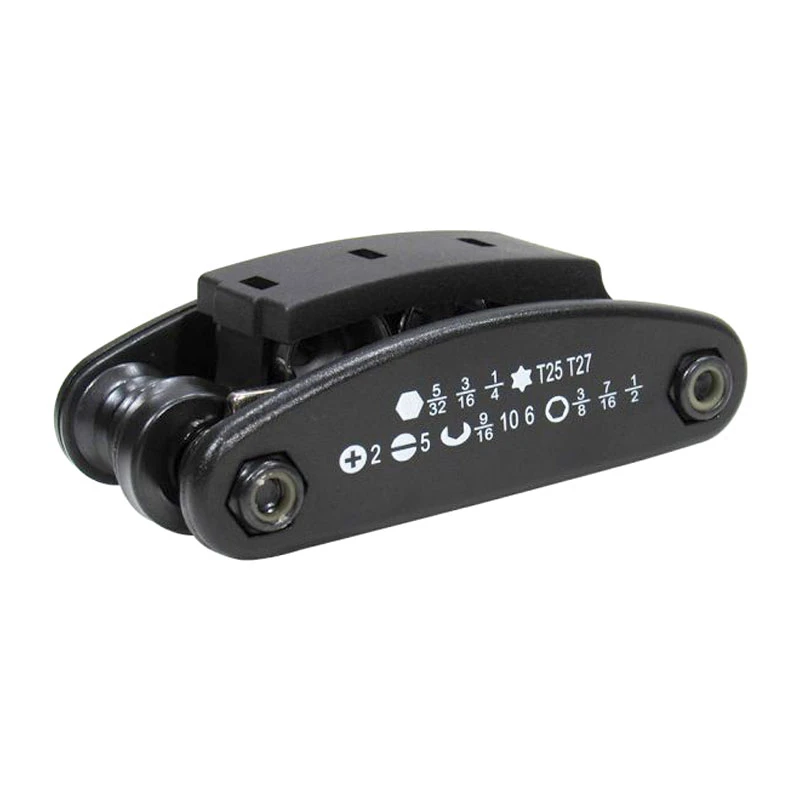 • Includes 5/32″, 3/16″, 1/4″ hex keys, T25, T27 Torx keys, 1/4″ driver with 3/8″, 7/16″, 1/2″ sockets, 10mm box and 9/16 open-end wrenches, Spoke wrench, and Slotted & Phillips screwdrivers