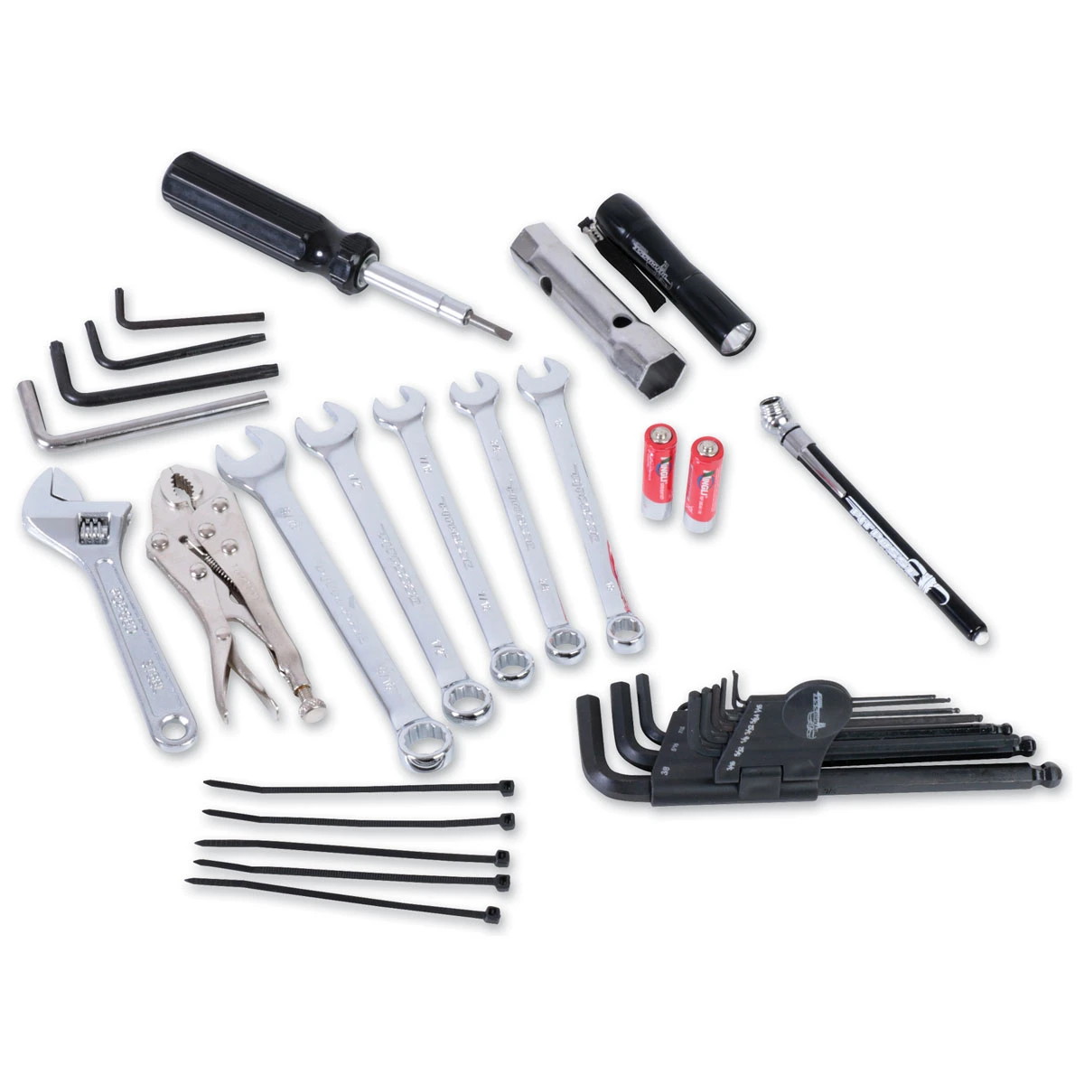 • Kit consists of: 3/8″, 7/16″, 1/2″, 9/16″, and 10mm wrenches, an adjustable wrench, 6-in-1 screwdriver, 10pc. SAE hex set, T25, T27, T40 Torx keys, 2-in-1 spark plug socket, locking pliers, LED flashlight, zip ties, air pressure gauge, and storage pouch